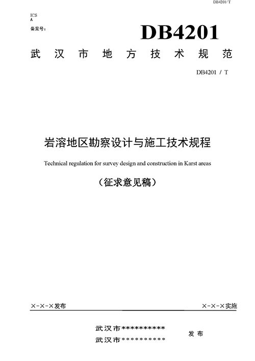 根據(jù)《市質(zhì)監(jiān)局關(guān)于下達2018年度武漢市地方標準制修訂項目計劃的通知綜合管理類(第二批)》(武質(zhì)技監(jiān)標[2018]5號)的要求,由武漢市勘察設(shè)計有限公司聯(lián)合相關(guān)單位共同起草的武漢市地方標準《巖溶區(qū)勘察設(shè)計與施工技術(shù)規(guī)程》(附件1)已完成征求意見稿。按照有關(guān)規(guī)定,現(xiàn)征求貴單位意見。請將意見填入對應(yīng)《征求意見反饋表》(附件2)并加蓋單位公章后,紙質(zhì)版(或掃描件)于2019年07月20日前反饋給武漢市勘察設(shè)計有限公司,逾期不復(fù)函,視為無意見。