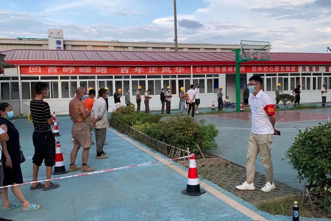 8月5日晚上18:00,公司黨員杜徐峰、宋友建、鄭暉、梅冬、余斌、陳澤風、李子紅在社區(qū)工作調(diào)度下,來到黃家湖污水廠核酸檢測點,協(xié)助做好核酸檢測工作。面對炎熱夏夜和蚊蟲叮咬,黨員們依然堅守在檢測現(xiàn)場,熱情耐心地為該項目現(xiàn)場共計200余名工人,進行信息登記、掃碼、維持現(xiàn)場秩序、講解檢測流程等,工作直至凌晨12點才結束。“我們處于與病毒賽跑的關鍵時刻,作為黨員,我們義不容辭要為這場戰(zhàn)斗添油助力!”黨員們紛紛表示道。