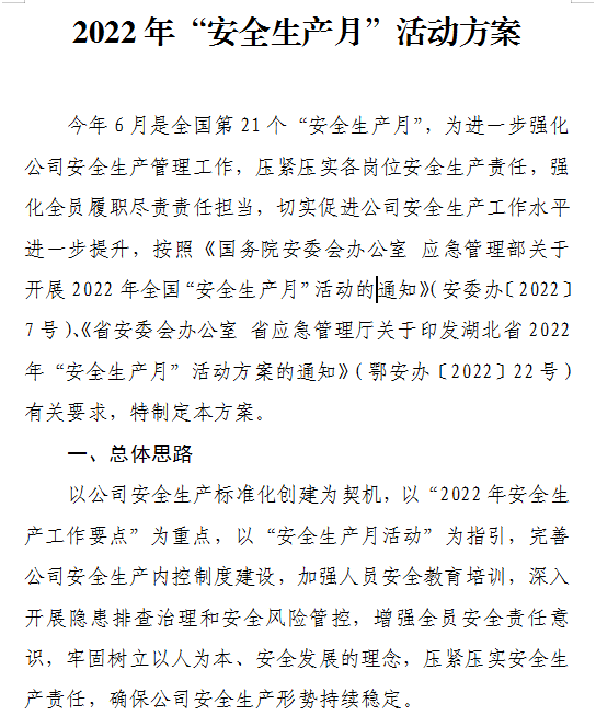 5月31日,公司研究制定了《2022年“安全生產(chǎn)月”活動方案》,成立了“安全生產(chǎn)月”活動領導小組,并以活動領導小組為核心,全面部署開展安全生產(chǎn)月專項活動,積極動員公司全員參與,充分彰顯了領導帶頭抓安全、人人講安全的良好風貌。