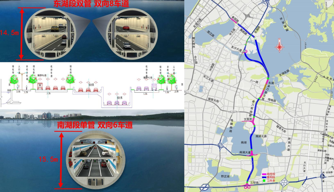 為更好地支撐城市空間發(fā)展,武漢市“十三五”規(guī)劃中要求“加大地下空間開發(fā)利用度,加強(qiáng)地下通道、地下停車場(chǎng)等地下交通設(shè)施建設(shè),啟動(dòng)實(shí)施‘負(fù)高架’工程,改善交通出行條件”。兩湖隧道作為世界上規(guī)模最大的城市湖底雙層超大直徑隧道,是武漢市重點(diǎn)市政工程,也是惠及武漢千家萬戶的重大民生工程。項(xiàng)目建成后,將在武昌片區(qū)形成一條南北向快速通道,可有效緩解二環(huán)線、珞獅南路、水果湖隧道等道路交通壓力,不斷完善區(qū)域路網(wǎng)體系,方便周邊地區(qū)居民出行。