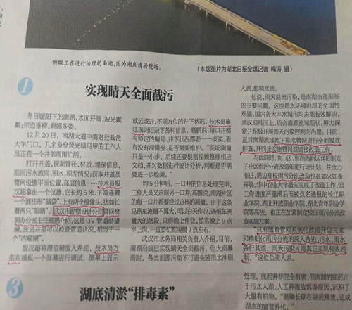 2018年12月20日,湖北日?qǐng)?bào)全媒記者親赴南湖隱患排查現(xiàn)場(chǎng),針對(duì)測(cè)繪工程公司所負(fù)責(zé)的“南湖水環(huán)境提升攻堅(jiān)工程”中的管線測(cè)量及隱患排查工作進(jìn)行實(shí)地采訪,F(xiàn)場(chǎng)技術(shù)員從現(xiàn)場(chǎng)作業(yè)流程、主要工作內(nèi)容及工作方式等方面作了詳細(xì)介紹,該采訪于2018年12月24日在湖北日?qǐng)?bào)第14版進(jìn)行了詳細(xì)報(bào)導(dǎo)。