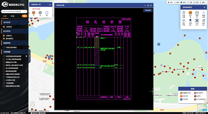 平臺基于標準化的工作流程,采用多重校審及分級管控的手段,通過配置,完成了從數(shù)據(jù)歸檔入庫到在線借閱的全過程服務(wù)與管理,滿足生產(chǎn)效率的同時保證了數(shù)據(jù)的準確性及安全性。平臺支持鉆孔地層的標準化,完成了歷史存量數(shù)據(jù)的坐標轉(zhuǎn)換,解決了因地層代號和坐標系不統(tǒng)一而無法共享的問題。平臺實現(xiàn)了在網(wǎng)頁端基于CAD繪制勘察圖件的功能,支持柱狀圖、剖面圖、等值線圖的自動生成?捎嗅槍π缘膶ρ芯繀^(qū)域鉆孔篩選過濾,使統(tǒng)計分析結(jié)果可靠度更高。平臺具有較完善的數(shù)據(jù)接口,實現(xiàn)了與公司自主研發(fā)的勘察資料處理軟件的無縫對接,兼容各種地質(zhì)專題GIS數(shù)據(jù)。不僅可直接入庫勘察軟件數(shù)據(jù),還能以項目和鉆孔的維度輸出涵蓋地層及試驗信息的可在勘察軟件中直接利用的文件。